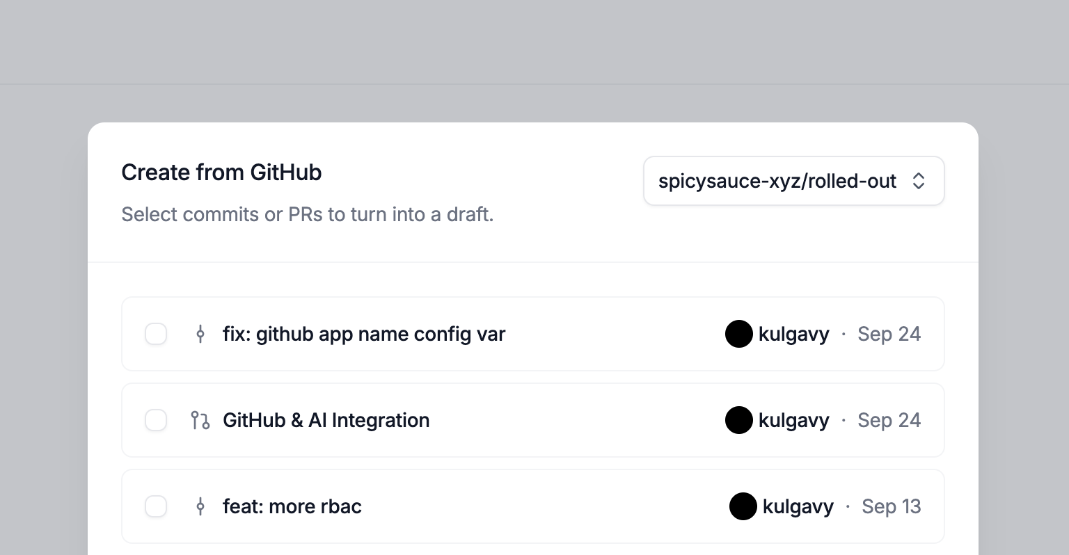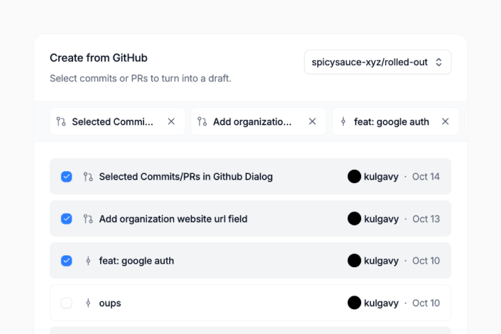 After you connect GitHub, the New Draft button becomes a dropdown with two options: Blank and From Commits. Choose From Commits to open a list of commits from the repositories you’ve authorized. Select the commits you want to include, and we generate a release note using AI that you can refine before sharing.