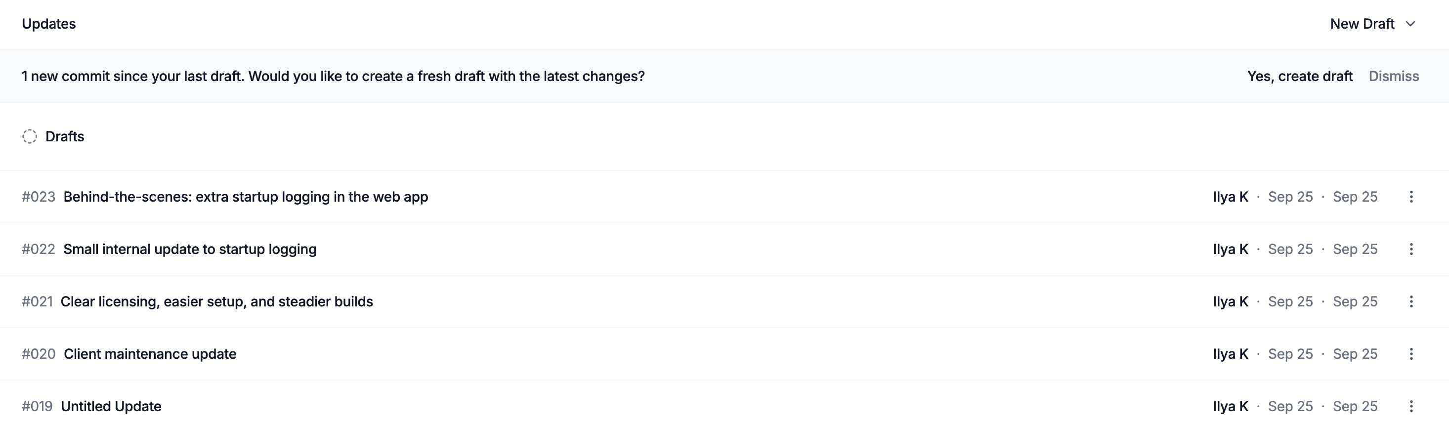 This keeps your workflow moving. You don’t have to dig through commit history or wonder if your draft is up to date. If you’re ready, spin up a new draft immediately; if not, dismiss and come back when it suits you.